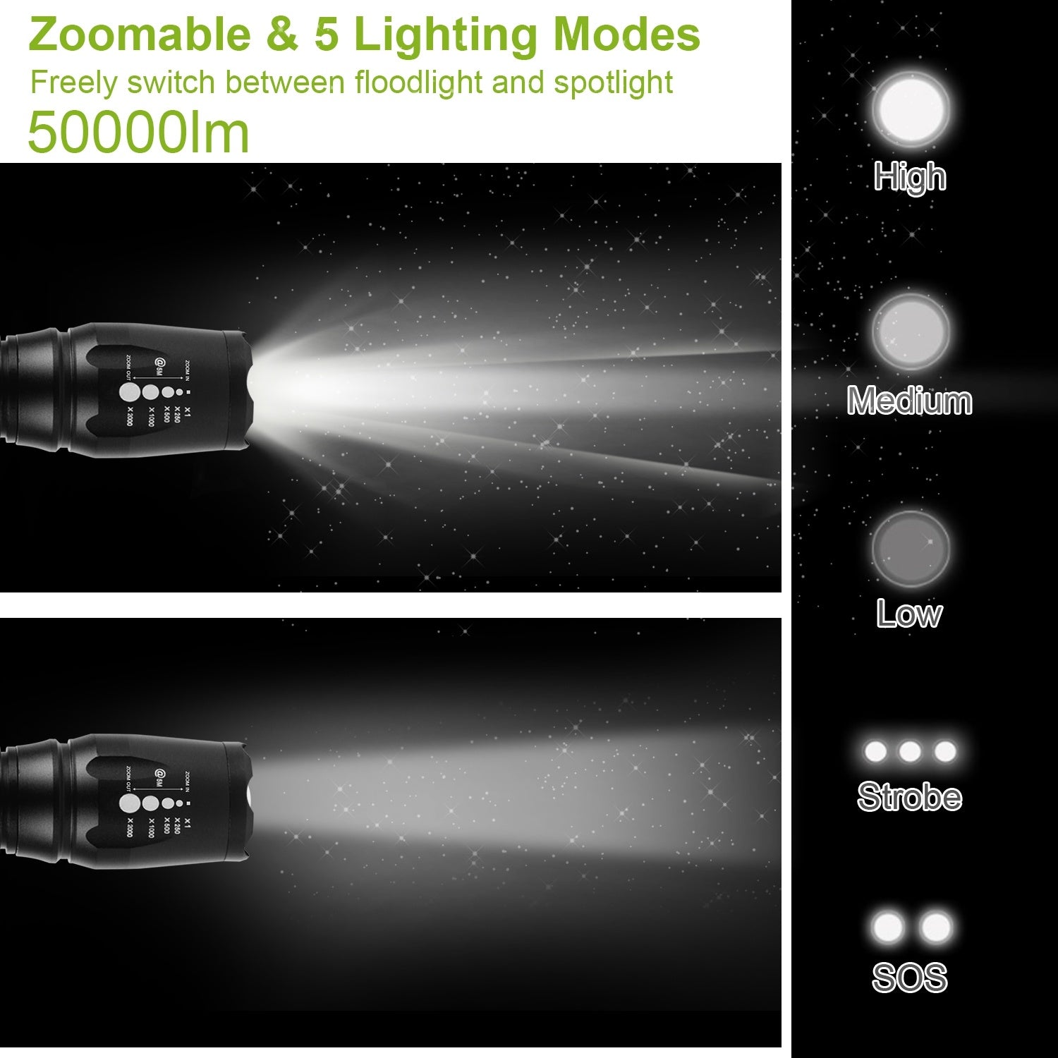 2Packs T6 Tactical Military LED Flashlight 50000LM Zoomable Rechargeable Flashlight Torch w/ 5Modes SOS Night Light