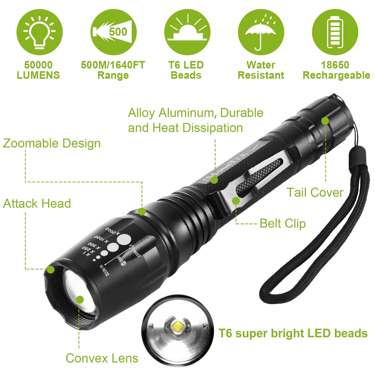 **ZOOMABLE FLASHLIGTH & ADJUSTABLE FOCUS*:Our premium T6 LED torch supports 1640ft lighting range;easy-controlled head-pulling zoom adjusts focus range for different usage,stretching to adjust its focus(x1,x250,x500,x1000,x2000) and get spot beam and flood beams you need. Bright zoomable focus optimal for distant observation and wide range illumination.