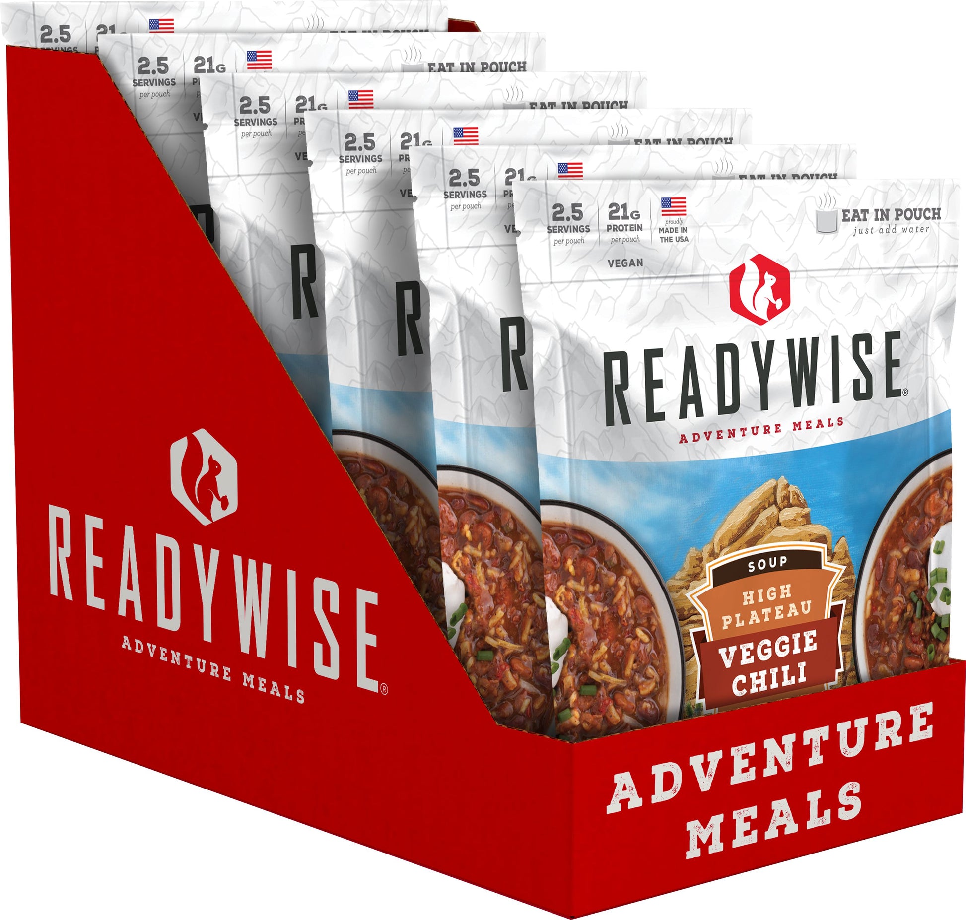 Each pouch of High Plateau Veggie Chili contains 2.5 servings and is resealable. These pouches are lightweight making the easily portable for any outdoor adventure. Just add water and you can eat directly from the pouch.